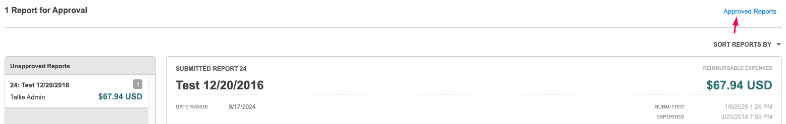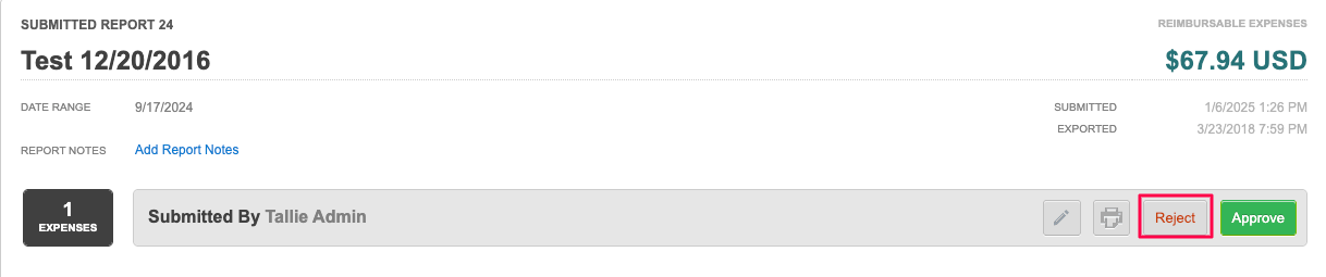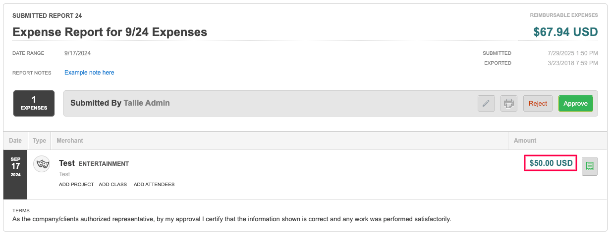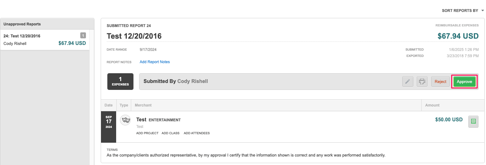 Approvers are responsible for approving an expense report to send it forward to be exported. Approvers can approve the report, reject the report, or edit the expenses.
