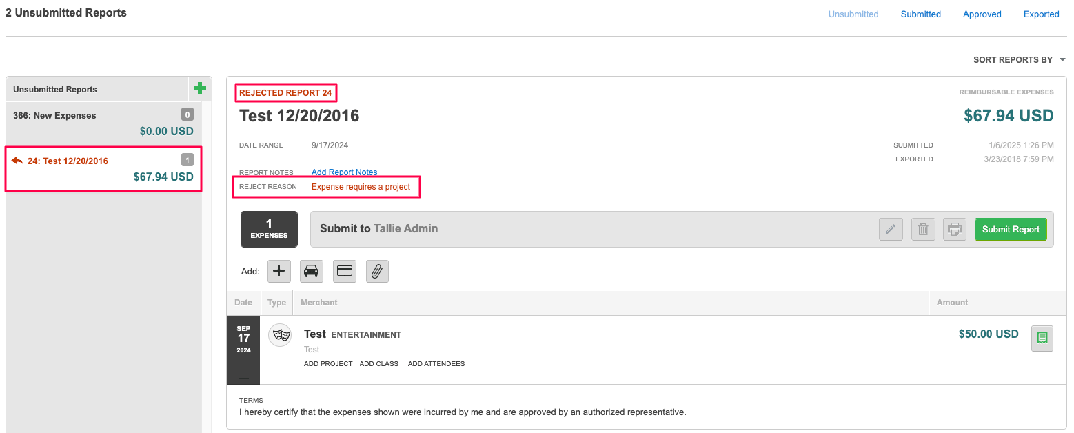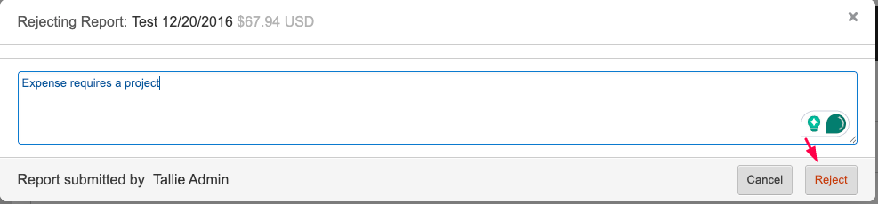 Before rejecting the report, you're able to enter notes back to the user explaining the rejection and steps needed to take in order to resubmit the report: