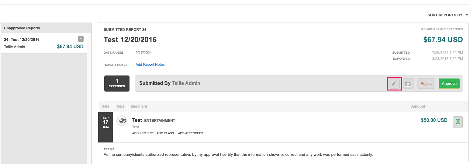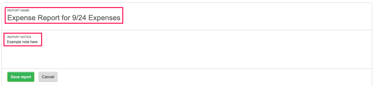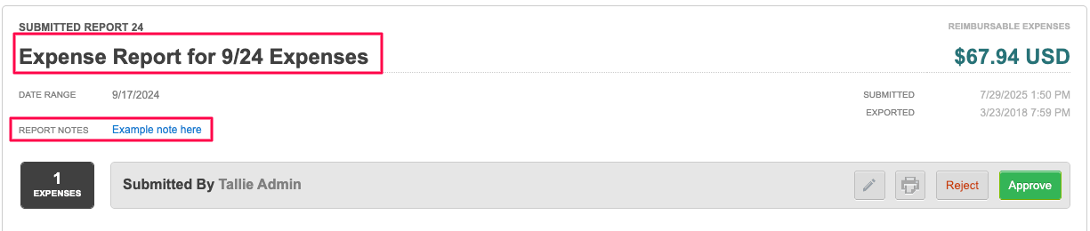 As an approver, you are also able to edit the name of expense reports and add notes to expense reports.