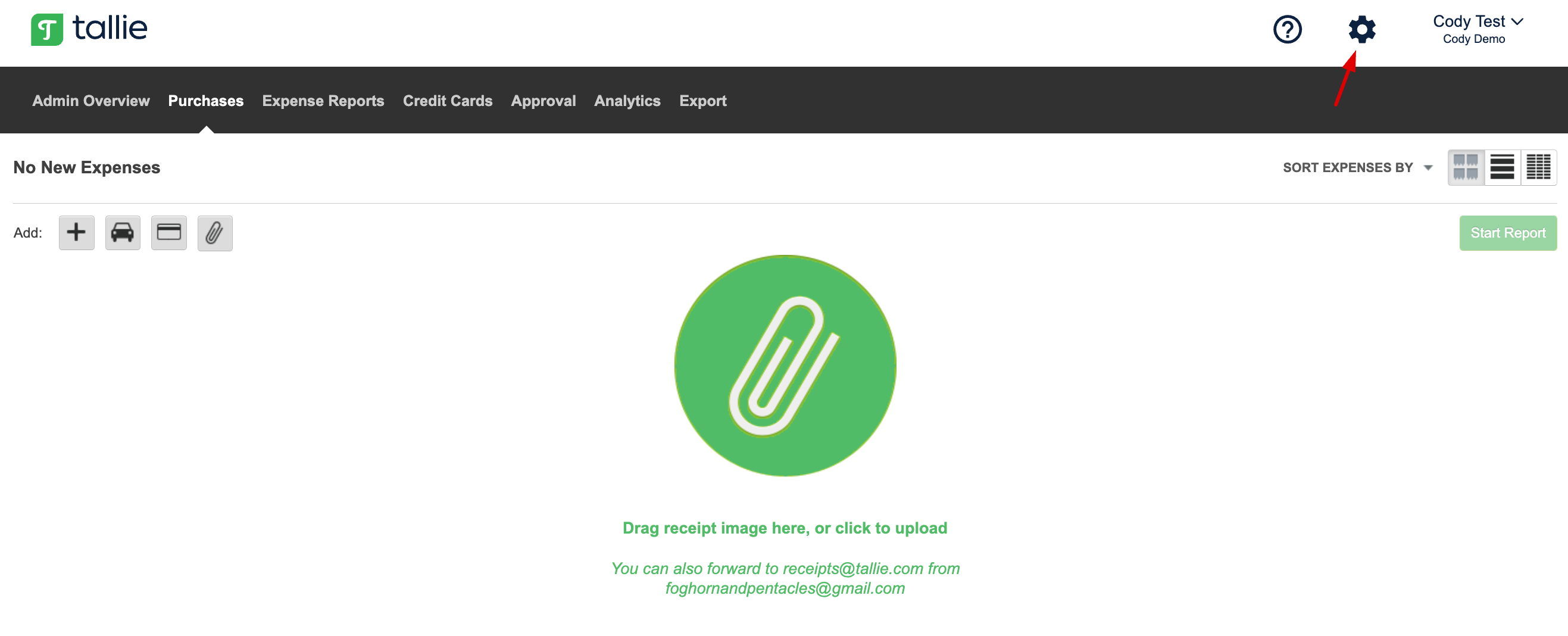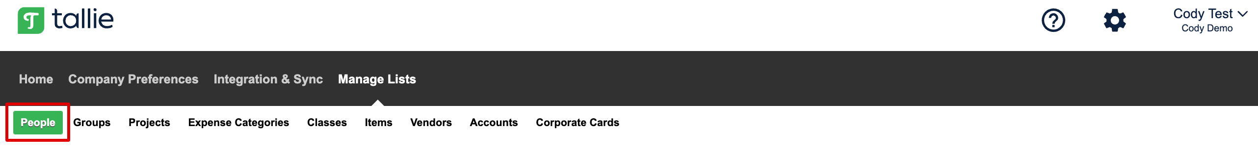 Step 1: First, be sure that the user receiving the errors has the Track Expenses permissions turned on. On your Tallie homepage, click the gear icon to access your company settings.