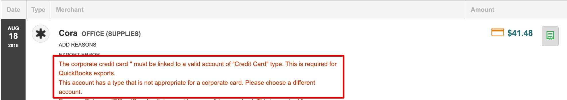 The GL account and vendor will need to be mapped to the card. Most accounting systems will require a GL account to be mapped, and BILL will require a vendor to be mapped to the corporate card. These mappings occur on the Corporate Card page. When they are not mapped, the below error message will appear upon export: