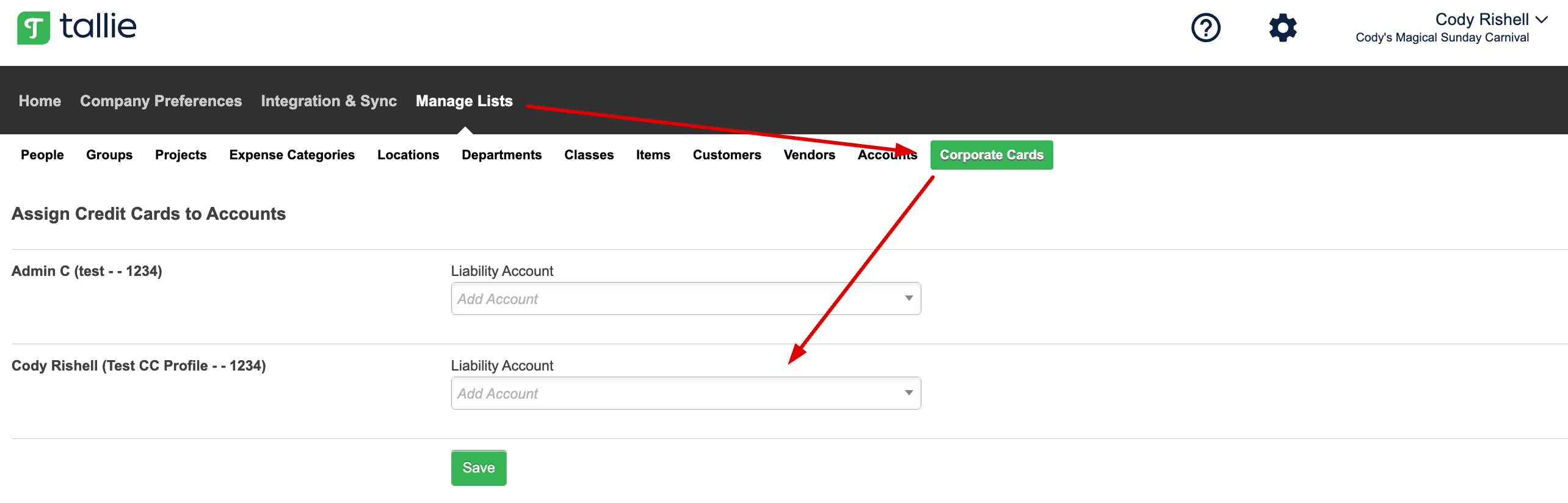 Step 1: Go to the Cog Wheel > Click Manage Lists > Click Corporate Cards.