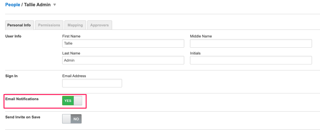 Notification reminders will automatically be sent from Tallie when certain actions are taken. In order to enable notifications, the option: Enable Notifications needs to be enabled to YES on the user profile. To enable or disable this feature, please see the steps below: